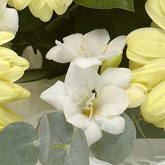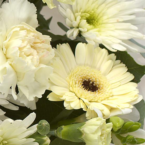 Subtle tones of white and cream Germini, Freesia, Carnations and Chrysanthemums with the muted beauty of an Opal.