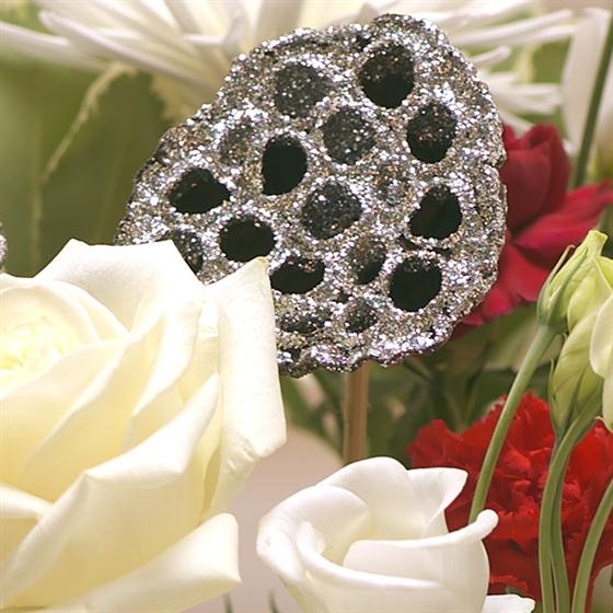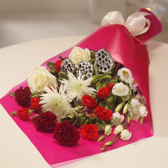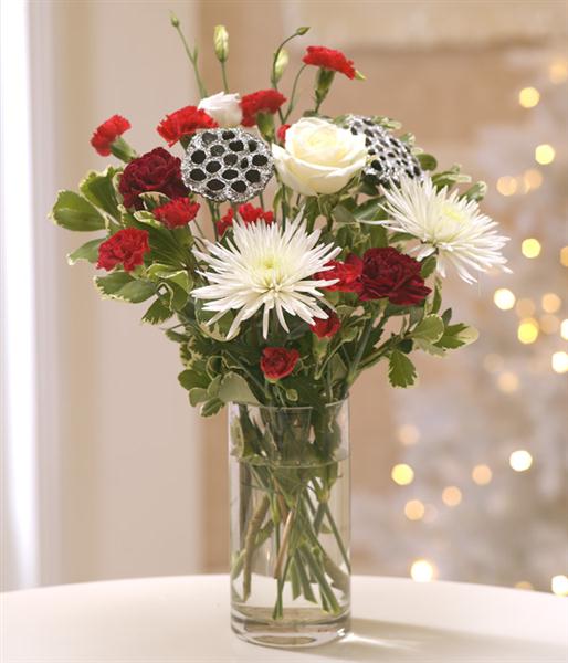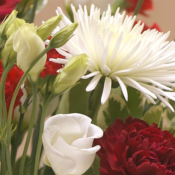 Add a little sparkle with this delightful Christmas bouquet. Cream Roses, pure white Lisianthus and deep red velvety Carnations are perfectly married with the wonderfully fluffy forms of white Bloom Chrysanthemums.