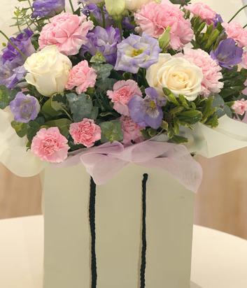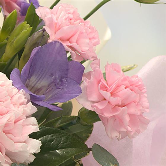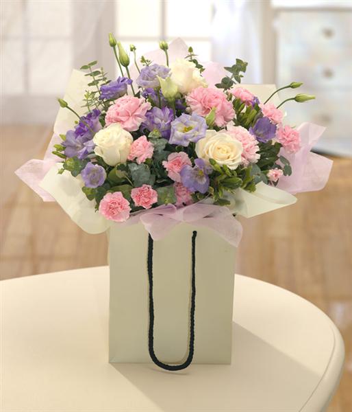 A great favourite. A beautiful selection of pink, cream and lavender Roses, Freesias and Carnations beautifully presented in a gift bag. Just so very pretty....