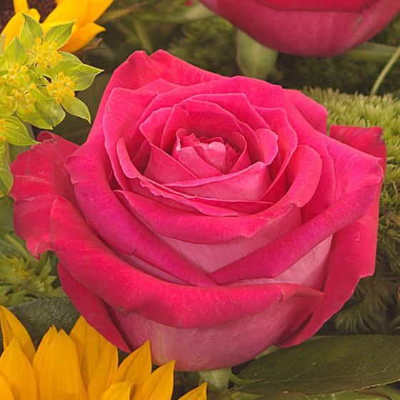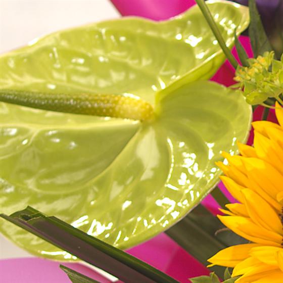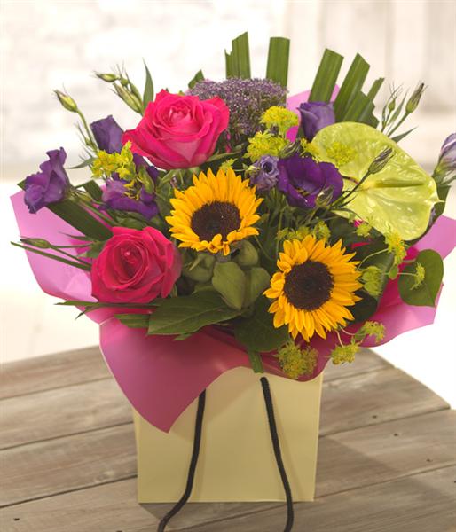 This bright, vibrant hand-tied is aqua packed in Water for freshness. Lovely Roses are accompanied by bright Sunflowers, vibrant Anthuriums and delicate Lisianthus. (Sunflower Season is APRIL to OCTOBER...Substitute is Large Yellow Don Leon Gerberas, with a Black Centre))