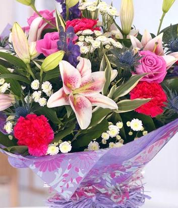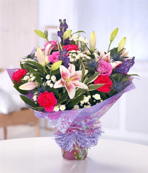 A gloriously colourful hand-tied bouquet containing mixed flowers in bright colours including Lilies, Roses, Carnations, Eryngium and Chrysanthemums. Presented in an aquapack for instant display and finished with complementary packaging.