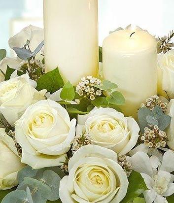 A stunning classic white candle centrepiece arrangement. White Roses, Orchids and Wax Flowers complemented by Aralia & Hosta leaves and a dash of Eucalyptus. Please allow 3 days for ordering during this busy festive season.