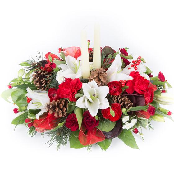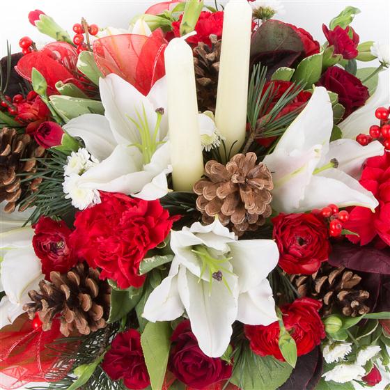 A beautiful, traditional table centre. Cones and ribbon give this arrangement a seasonal feel without the sparkle.