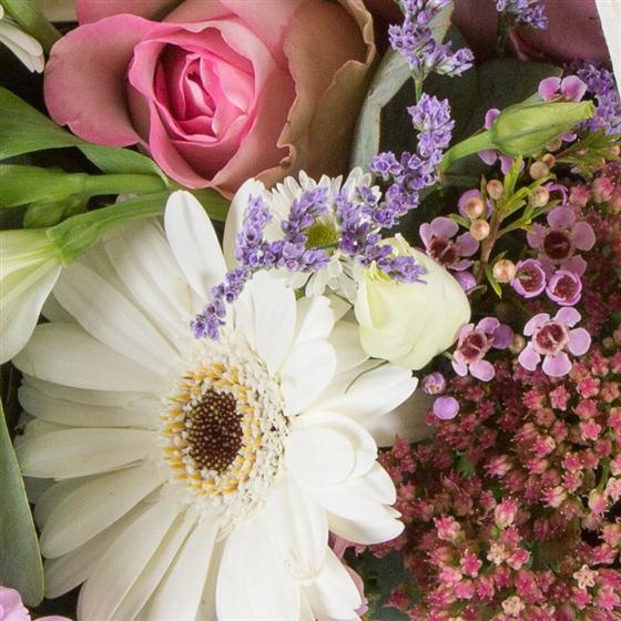 A pastel collection of dainty blooms in pinks, whites and lilacs, including roses, sedum, limonium, wax flower and lisianthus.