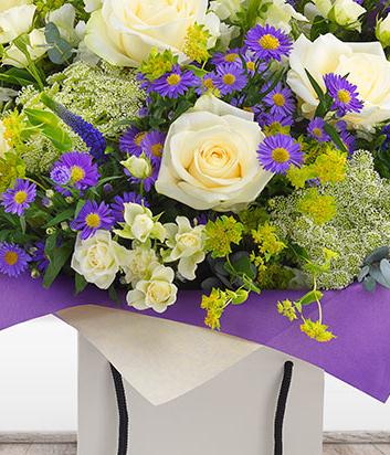 A pretty purple and white gift bag flower bouquet featuring white Roses, antirrhinum, phlox and ammi with purple veronica and mauve Aster....stunning!