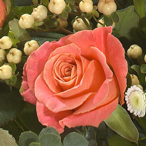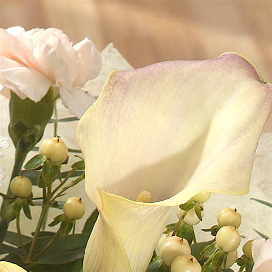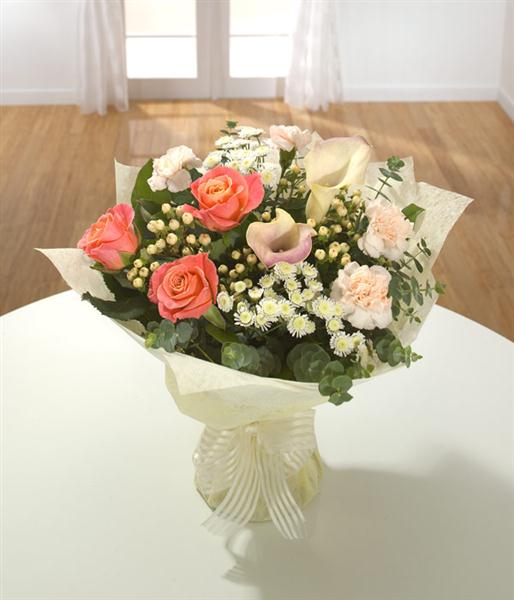 A sumptuous hand-tied aqua pack with Roses, Calla Lilies and peach Carnations. Chrysanthemums and shiny Hypericum berries complete the picture.