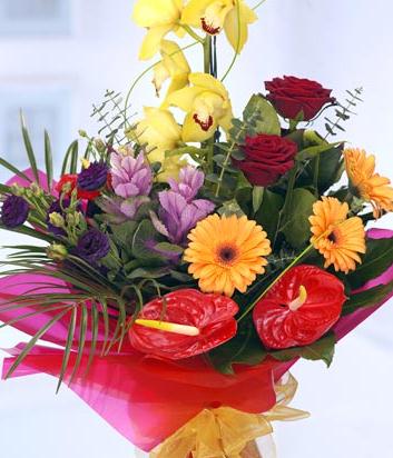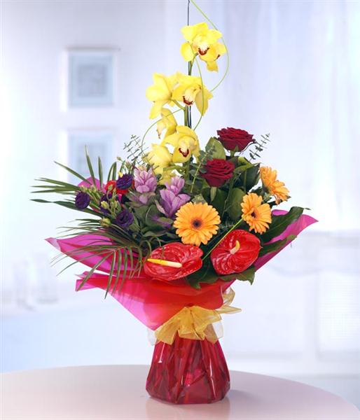 A modern hand-tied bouquet of mixed flowers in bold colours. Including Roses, Anthurium Lisianthus, Gerbera, Orchids and Chrysanthemums. The bouquet is finished with striking packaging in an aquapack for instant display.