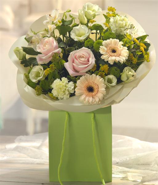 A delightfully delicate Mother's Day floral gift bouquet presented Aqua packed in water. Pretty pink Roses are neatly nestled alongside pure white Alstroemeria and Lisianthus. Peach Germini, green Chrysanthemums and Carnations complete this beautifully presented bouquet.