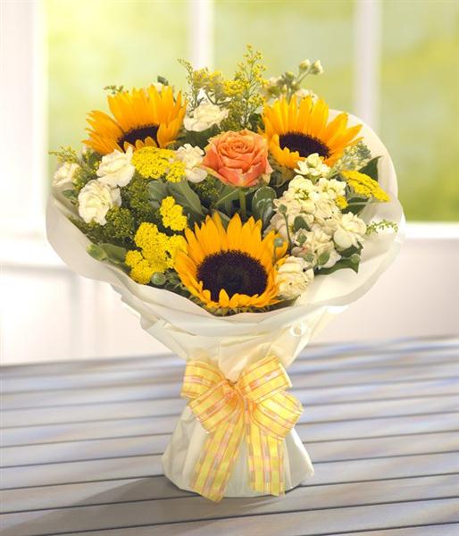 A bright, summery collection of sunflowers, carnations and roses. A summer sun scentsation aquapack bouquet.