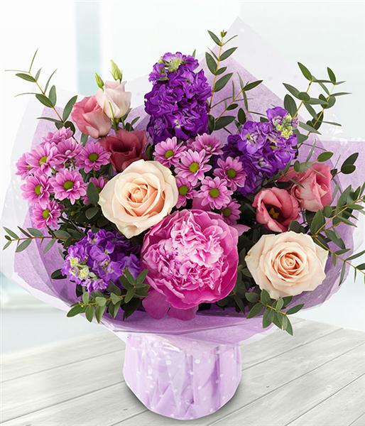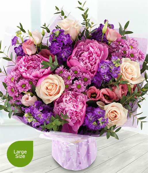 An incredibly gorgeous aqua pack bouquet featuring pink peonies, roses, lysianthus, carnations and purple stocks. A touch of eucalyptus completes the arrangement. (PEONY SEASON MAY TO JULY)