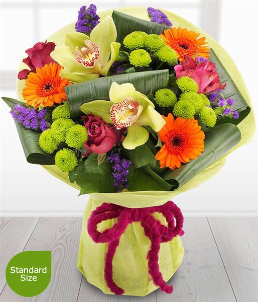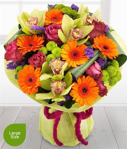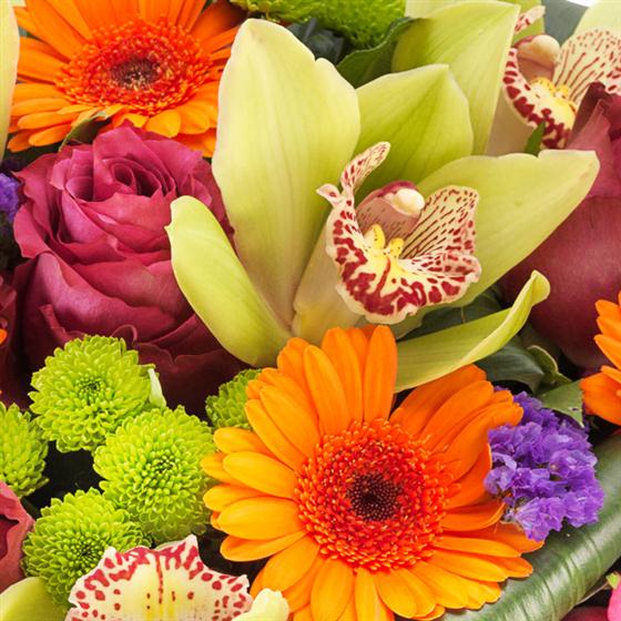 Green Cymbidium Orchids are nestled in amongst cerise Roses, orange Germini, purple Satis and green Spray Chrysanthemums. An absolutely stunning display that’s bursting with colour.