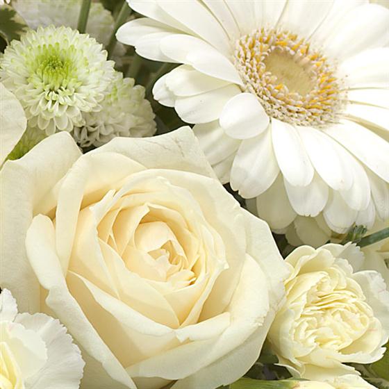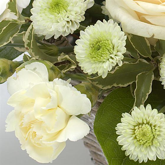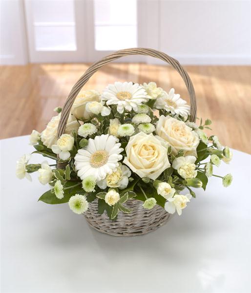 Pale and interesting? A white and cream basket arrangement of Roses, Germini, Carnations and Chrysanthemums.