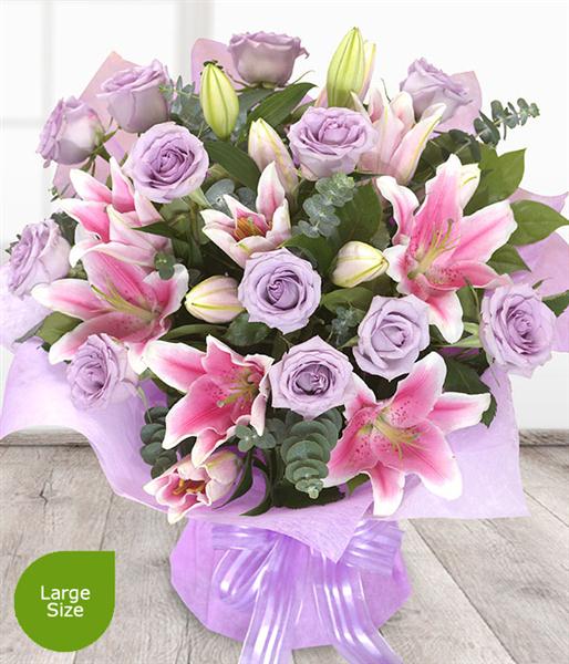 Lavender Roses and pink Lilies make this arrangement beautifully soft and gentle. A very attractive combination of gorgeous lavender Roses and pretty pink Lilies. Aqua packed for freshness, it's ready to display.