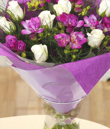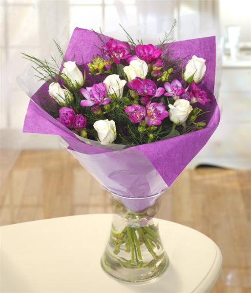 A sumptuous mix of luxurious purple Freesias and white Roses, complimented perfectly with tree ferns. An enchanting, fragrant bouquet.