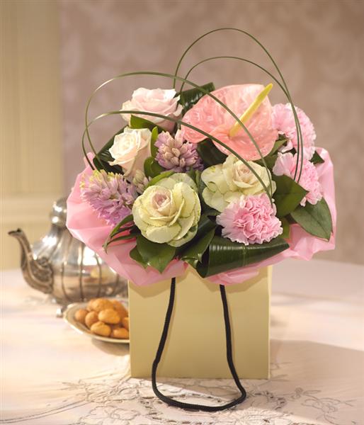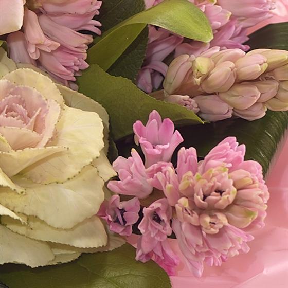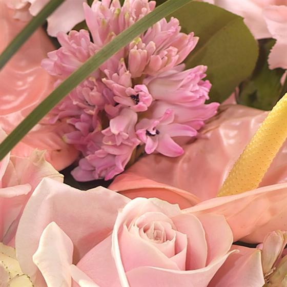This modern fragrant design includes Brassica, Roses, Hyacinth, Carnations and exquisite Anthurium blooms.