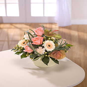 Stylish yet easy care. This arrangement in a container features Roses, Germini and trendy Anthuriums.