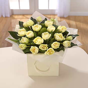 A classic and serene hand-tied of double white Tulips beautifully presented in a cream bag.