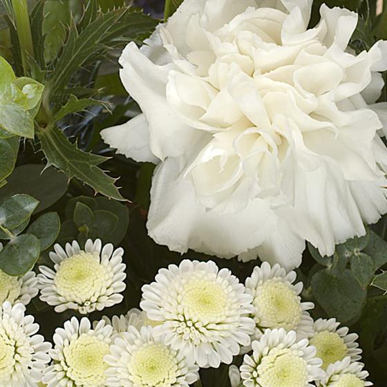 Whites all the way with Roses, Carnations and Chrysanthemums. Aconitum and Eryngium add the accents of blue.