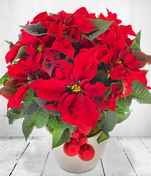 Get in the Christmas spirit with this beautiful, Red Poinsettia in stylish ceramic with festive baubles. The perfect gift for your loved ones this year.