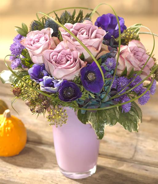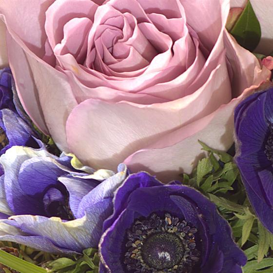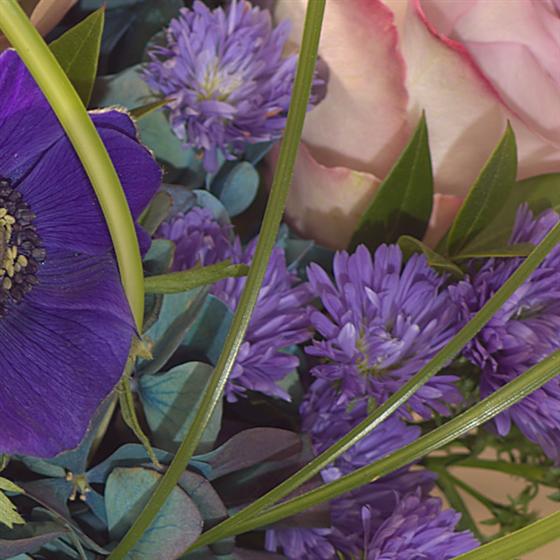 A simply enchanting flower arrangement in rich royal blues and delicate lavender shades perfectly presented in a stylish glass vase or container.
