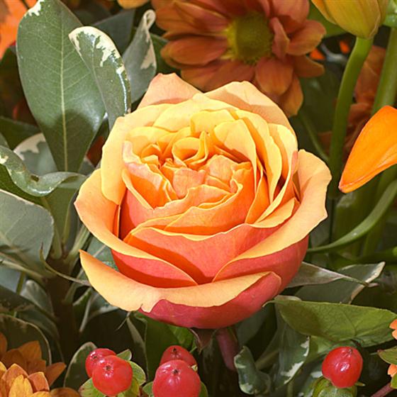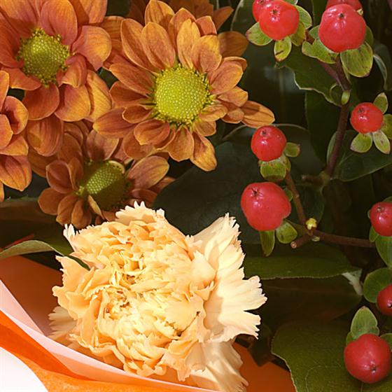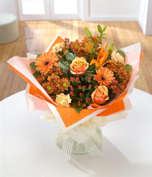 Lilies, Roses and Germini take the lead in this stunning hand tied arrangement delivered in water for extra freshness with orange Chrysanthemums and gold Carnations providing signature notes.