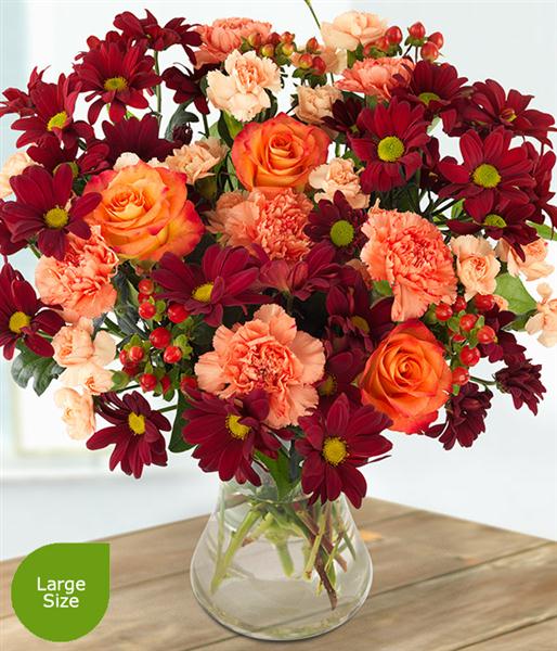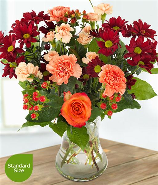 Bring home a hint of autumn with this glorious bouquet. Orange Roses, Carnations and Hypericums are perfectly married with red and peach Spray Chrysanthemums.
