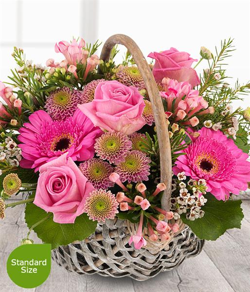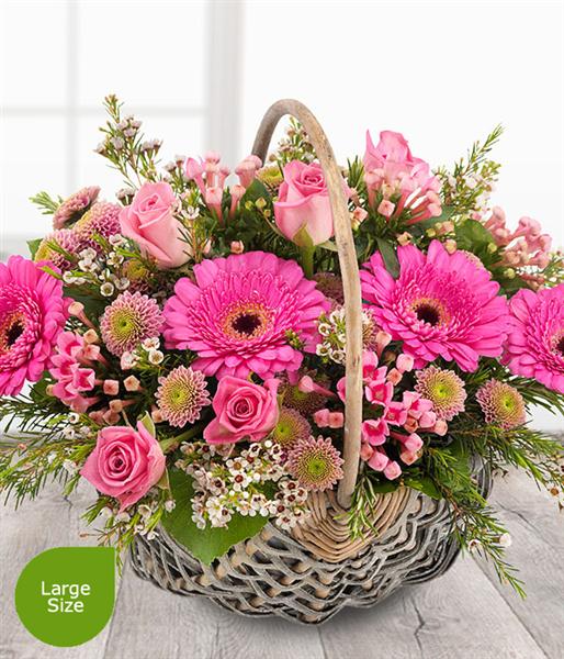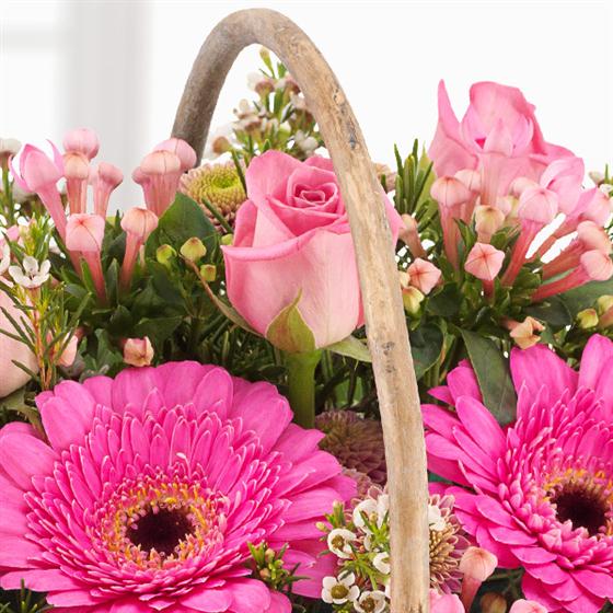 A really pretty pink flower basket overflowing with Roses, Spray Chrysanthemums, Bouvardia and Germini coupled with delicate cream Wax Flowers. Gorgeous!!