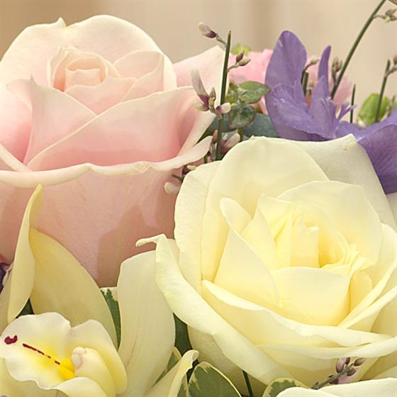 A fragrant delight of country style flowers, including white Roses, Orchids, Freesias and pink Carnations lovingly created and presented in a stylish gift basket. Very pretty.