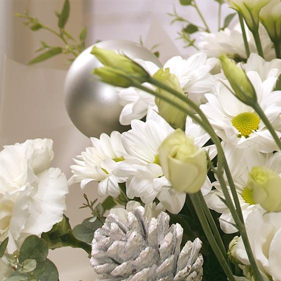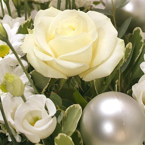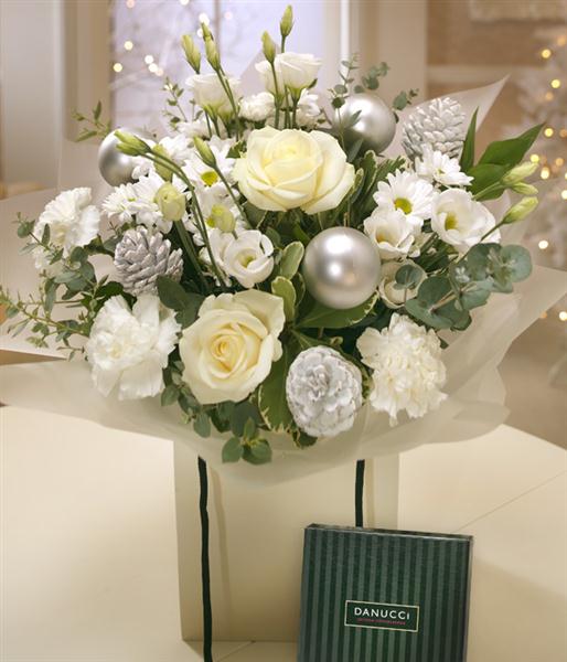 Crisp, cool creams and whites in the form of Roses, Lisianthus and Carnations, combined with Eucalyptus and Ruscus create a beautiful snowy white aqua pack gift bag bouquet. Includes a delicious box of Chocolates.