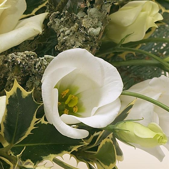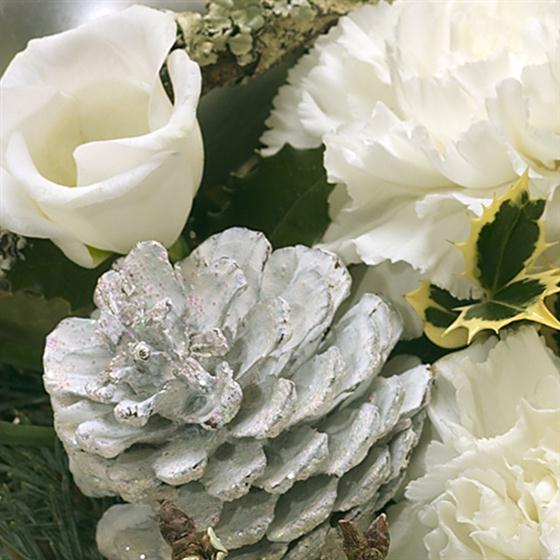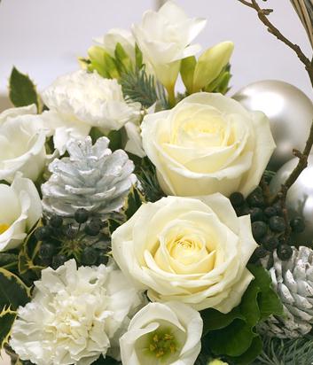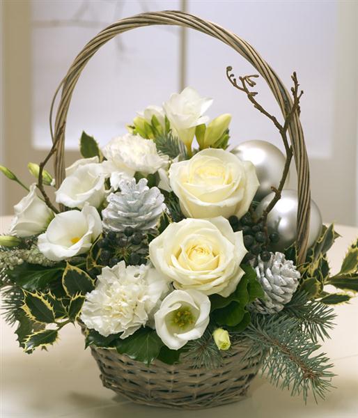 A beautiful Christmas flower basket comprising of cream Roses, white Freesias, Lisianthus and Carnations. Pine Cones and Holly sprigs complete this festive arrangement.