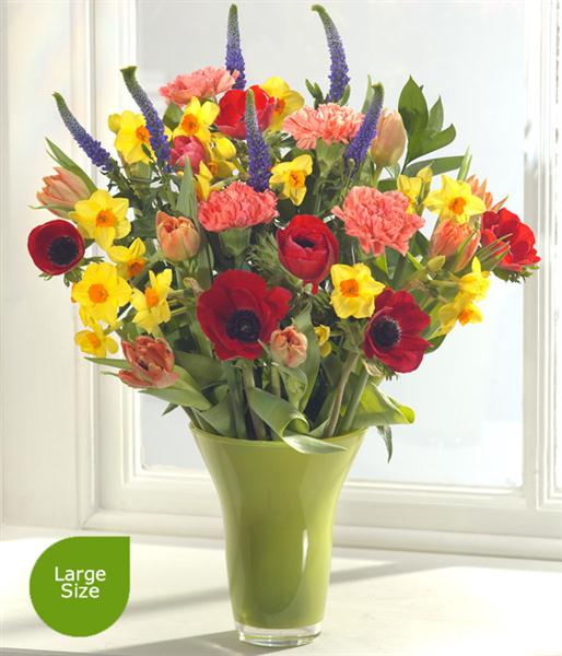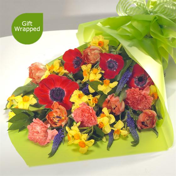 A fantastically bright and simply stunning spring flower bouquet. Rich Anemone have been perfectly married with sunshine yellow Paperwhite Narcissi and striking purple Veronica. Orange Tulips and Carnations complete the arrangement.