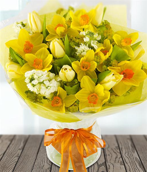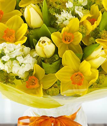 Send some sunshine with this cheerful aqua-pack of yellow Daffodils, cream Tulips and white Stock topped with Bupleurum.