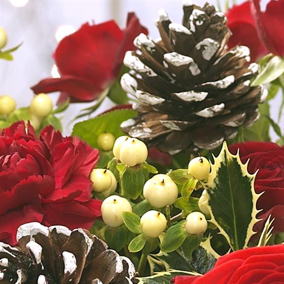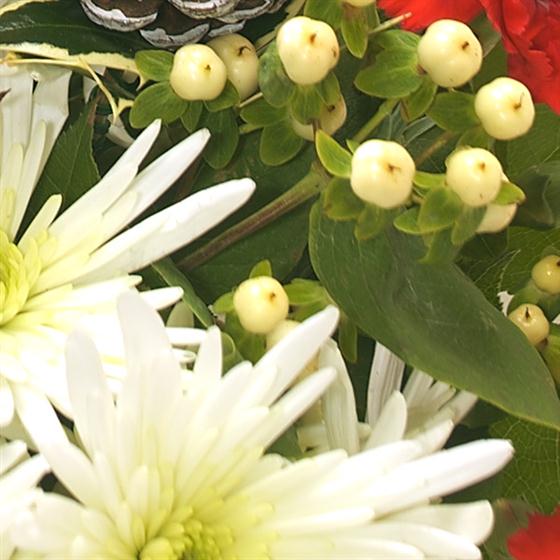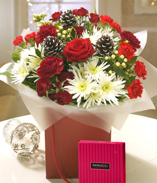 An ideal Christmas flower gift - rich red Roses married with deep red velvety Carnations sit perfectly alongside the creamy white flourishes of spray Chrysanthemums. White frosted Pine Cones and a delicious box of Chocolates completes the gift.