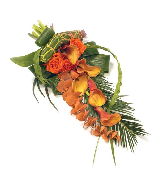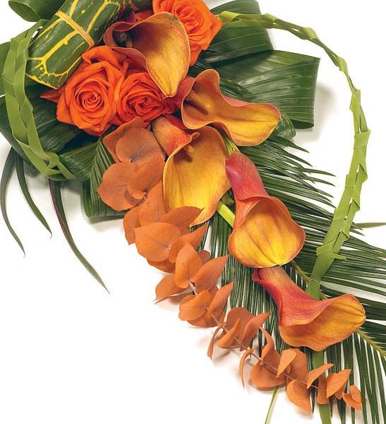 Calla lily and rose sheaf in shades of orange. Approximately 24"