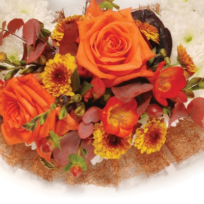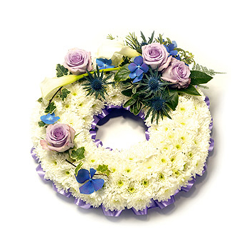 Based white Chrysanthemum open round wreath including Roses, Hydrangea and Eryngium with complementary foliage. Available in 2 sizes. Standard..14" Large..16"