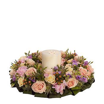 A lovely white church candle encompassed by a pretty pastel wreath. Pink and cream Roses, pink Hydrangea and Hypericum are mixed with purple Lisianthus and white Eryngium.