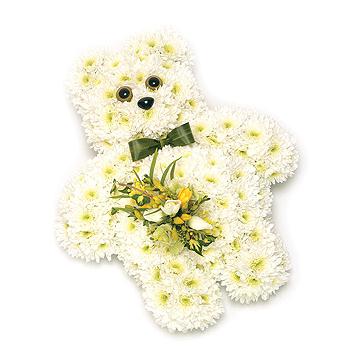 White Chrysanthemum based teddy bear design with leaf 'Bow Tie' and white & Lemon spray of Freesias and spray Roses. Size: Height - 48cm (19") Width - 38cm (15").