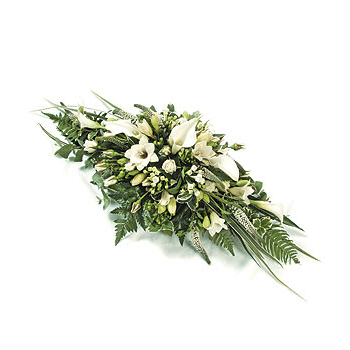 Childs spray with white calla lilies and freesia and spray roses with complementary foliage. Size: Width - 61cm (24")...Large..30"