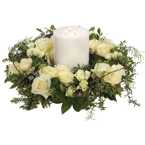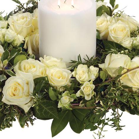 A lovely white church candle encompassed by a white Rose and Jasmine (in season) wreath with foliage.