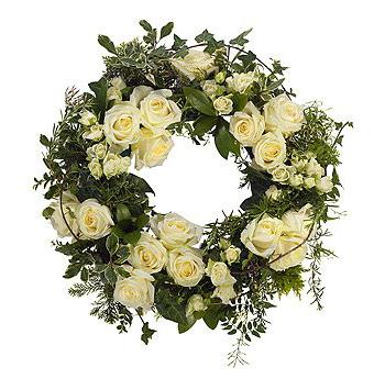 A beautiful white Rose and Jasmine (in season) wreath with a generous mix of foliage. Available in 3 sizes.